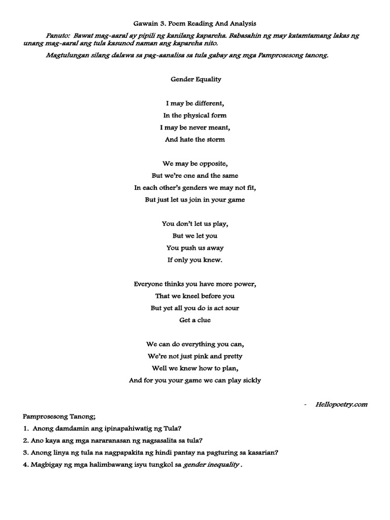 Lalakit Babae Pantay Pantay Lamang. Which of the following has a speed. Tula tungkol s gender equity.