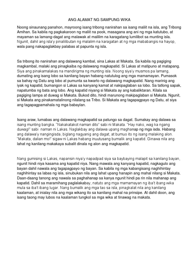 Sa isang nayon nakatira ang pamilya ni Pepaysya ay laki sa bukid at mahirap. Alamat tungkol sa pinagmulan ng wika Noong sinaunang panahon mayroong dalawang taong umusbong sa isang mala-paraisong lugar ng Akiw. Ang mga panandang salita naman ay.