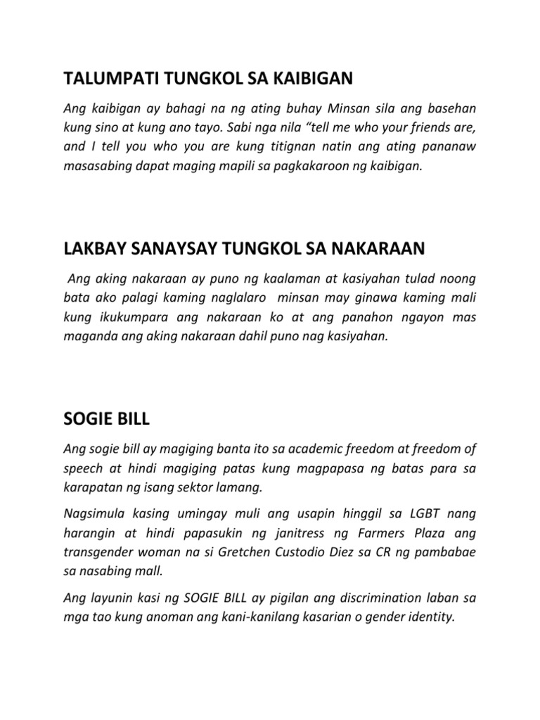 Gumawa ng kaukulang aksyon para masolusyunan ang naturang bullying na. View TALUMPATI EXAMPLEdocx from ENG 100 at Manila Science High School. Mayroon talagang mga taong walang pakealam kung makakasakit sila ng tao basta mapahayag at masabi nila ang.